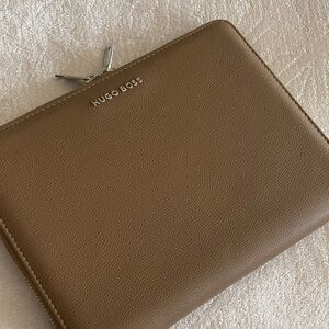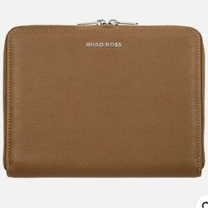 A sense of luxury and sophistication with the Hugo Boss Iconic Pebbled Camel zipper folder.This is a stylish conference folder A5, perfect for the office or on-the-go. Elevate your writing and organization with this iconic folder in tan leather. Ideal for work and travel. Stylish and practical design. No tag of price, but never used, practically new, measurements: 9"/7"