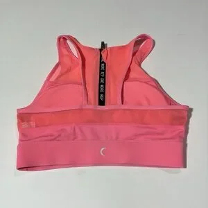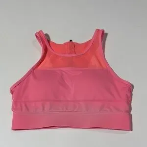 Stay comfortable and stylish with this pink sports bra, perfect for any workout. Mesh detail and zip up back. Good used condition. Some slight fading along the bottom. Does not affect the wear of this item, but price lowered due to this. Size medium. Pet free and smoke free home.