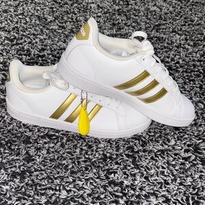 Chic Adidas sneakers with gold stripe accents. Comfortable and stylish for everyday wear.