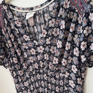 Chic floral maxi dress with short sleeves. Features a black and white pattern with subtle red accents. Perfect for casual outings.