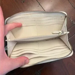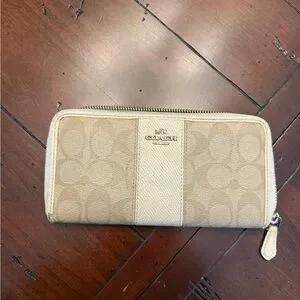 Elegant Coach wallet in light tan. Features iconic logo pattern and zip-around closure. Stunning wallet. Used. Thrifted. Needs some inside repair with chipping shown in photos.