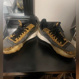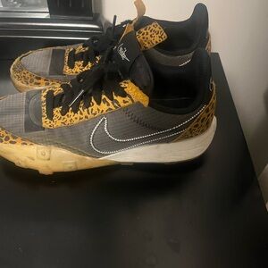 Bold Nike athletic shoes with a striking leopard pattern. Features black and yellow accents. Perfect for a standout look.