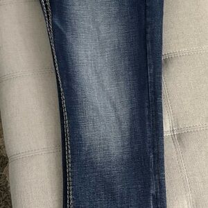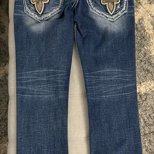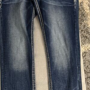 Indigo jeans with intricate embroidery. Signature Rock Revival style.