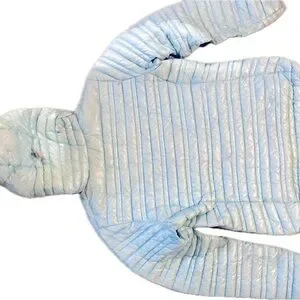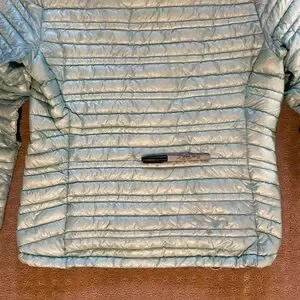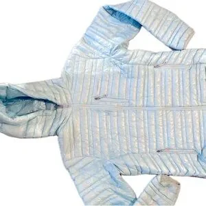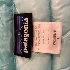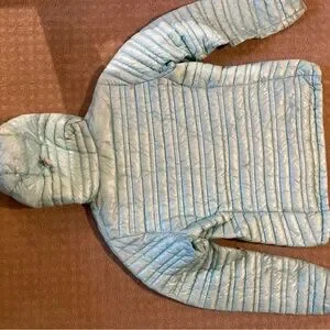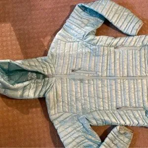 Elegant sky blue jacket by Patagonia. Ideal for all seasons. Has a small repaired hole on the back of the jacket. It’s a beautiful ice blue color and packs up nicely.