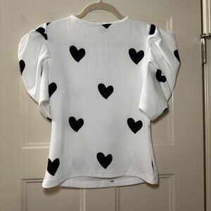 Shein top, white with black hearts, puff sleeves, size small, NWOT