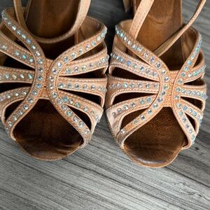 Rhinestoned dance shoes with a flexible sole and strappy fit. Visible wear as shown in photos. Beautiful pair!