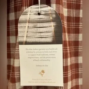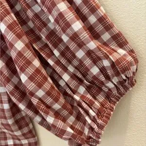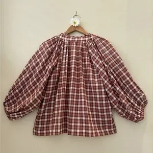 Chic oversized cotton blouse with a relaxed fit. Features a checkered pattern in the color Red Clay. Tie neckline. Very full sleeves with elastic wrist. Ideal for casual elegance.