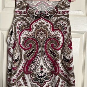 Stylish open cardigan with a paisley print. Features a mix of red, brown, and white colors.pit to pit - 24. 27” long