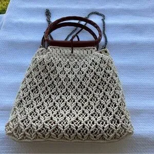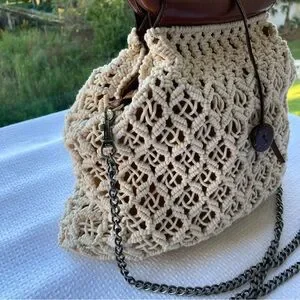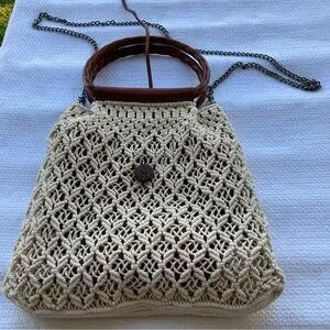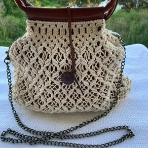 Chic crochet design with a sturdy brown handle. Perfect for casual outings.