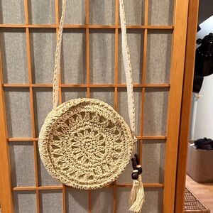 This cute handcrafted crochet bag features a unique round design. Perfect for adding a touch of bohemian style to any outfit. The beige color complements any wardrobe.