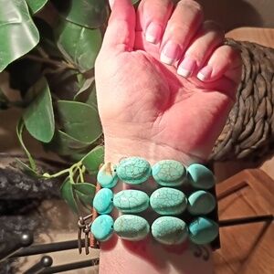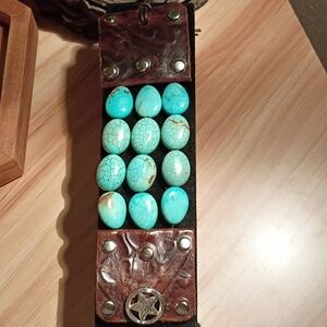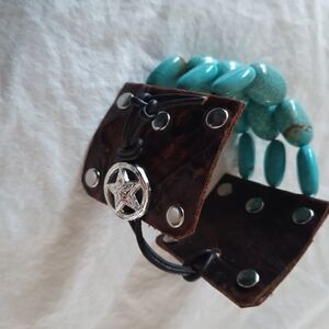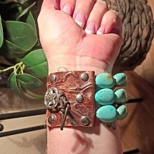 Gorgeous hand made by a Fort Worth, Texas artist bracelet with turquoise beads and leather strap. Features a unique Lone Star metal clasp. This will compliment any Southwestern style outfit for a date night or ladies brunch sipping mimosas.