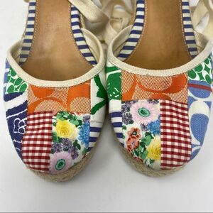 EUC Coach lace-up espadrilles in size 7. They have a woven wedge and fun patchwork toe. Size 7, they are a cute summer look.
