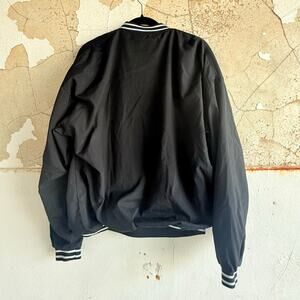 Vintage Reebok pullover jacket, mens black 90s windbreaker with embroidered logo at chest, striped V-neck collar, and elastic cuffs and hem. A retro athletic pullover that feels equal parts streetwear and sports nostalgia, the kind of jacket you throw on and it turns sidewalks into sidelines. Lightweight polyester shell with cotton blend lining.
