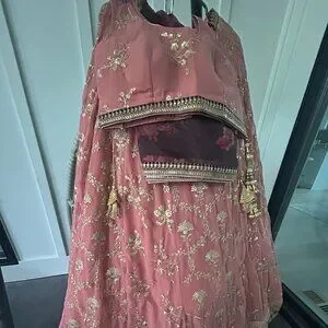 Grab the second look in this elegant attire for this season. Be an angel and create a smashing impact on everyone by wearing this pink georgette a line lehenga choli. Beautified and stylized with embroidered, sequins, thread work and zari work to give you an attractive look. Comes with matching choli and dupatta. (Slight variation in color, fabric & work is possible. Model images are only representative.)