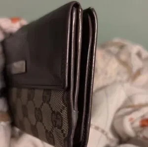 Chic vintage Gucci clutch with iconic pattern. Rich brown leather accent. Versatile and stylish. Please enlarge pictures to see any flaws. Could use professional cleaning in spots. Approximately 7 1/2 x 3 1/2. Thanks for looking and have a great day.