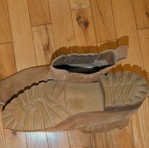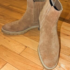Beautiful quality tan suede pull on ankle boots. Color is richer than photos show, more of a cognac. Women's size 10 from Dolce Vita. The boots are water resistant with excellent traction, great for winter. I'm very sad to part with these, but they are just a bit too snug. Only worn a handful of times, slight salt marks as shown.