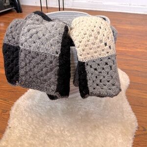 Cozy crochet blanket with a patchwork design. Features black, gray, and cream squares.