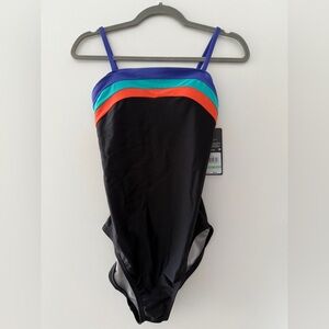 Make a splash in this sleek and sporty Speedo one-piece swimsuit, designed for performance and style. The black body is accented with vibrant colorblock stripes in cobalt blue, teal, and orange for a dynamic poolside look.