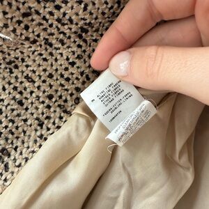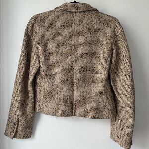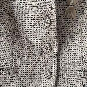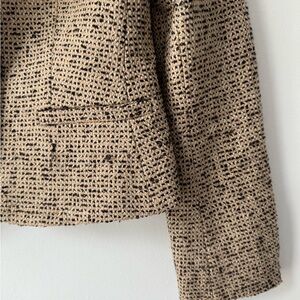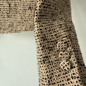 Moschino wool–alpaca blend tweed blazer with 3D floral appliqué details. Made in Italy. Classic tailored silhouette with a cropped fit, single-breasted front, and button cuffs. Neutral beige and black woven tweed with tonal fabric flowers at the chest and shoulder for a romantic, feminine touch. Fully lined.