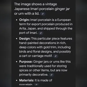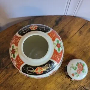 Vintage Japanese Imari hand painted porcelain ginger jar. Vibrant multicolor design, perfect for adding a touch of artistry to your home decor. The intricate patterns and rich colors make it a standout piece. 4.5 ×6 real gold accents excellent pre loved condition no flaws!