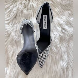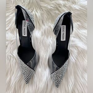 Rhinestones and clear panels bring edge to a pointed toe pump that definitely packs a punch.