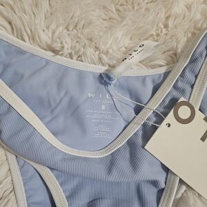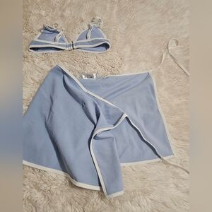 Stylish blue bikini set featuring a matching skirt. Perfect for a chic beach look.