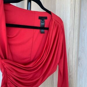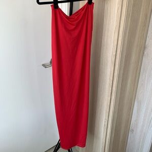 Red two piece gown with a slouchy long sleeve crop top and side slit maxi skirt