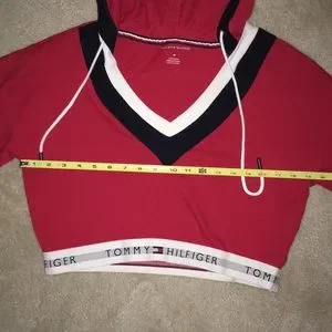 NWOT red retro style Tommy Hilfiger cropped hooded v-neck sweatshirt. Fairly lightweight.
