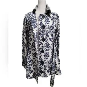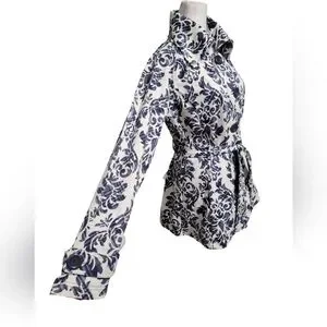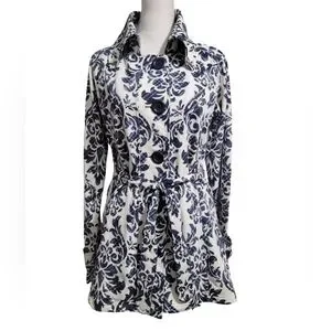 LA Kitty Size Medium Trendy Stylish Floral Blue and White Lightweight Pea Coat with High Collar that stays Snapped into place, Button Down, Waist Tie, 2 Front Slit Pockets, Long Sleeve with Button Detail on Cuffs. Elevate your style with this elegant floral pea coat. Featuring a striking blue and white pattern, this coat is perfect for any occasion. Stay warm and fashionable.