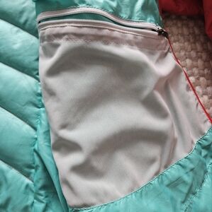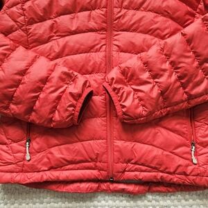 Patagonia bright red Down Sweater zip up puffer jacket size medium. Zippered pockets on the outside. One zippered mesh pocket on the inside. Drawstring at the hem so the bottom can be tightened. Color is a bright tomato red with fun ocean blue interior.