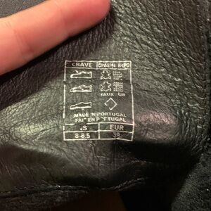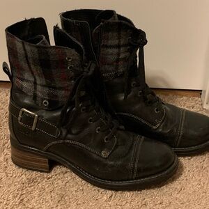 Stylish black leather ankle boots featuring a unique plaid detail. Perfect for adding a touch of sophistication to any outfit. Barely used.
