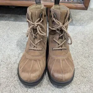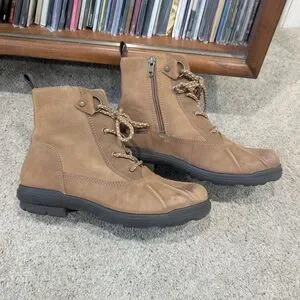 Bought to wear on winter vacation and wore a few times but realized they just don't suit my style, but the toes saw a little wear from that trip. Some pilling on fabric inside of shaft. Other than those flaws it's in great condition.