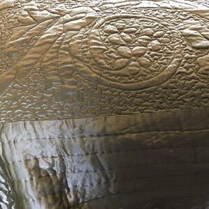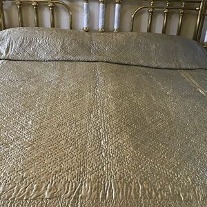 Enhance your bedroom with this elegant cream quilted bedspread. Its intricate design adds a touch of sophistication to any decor. HOW BEAUTIFUL IS BEAUTIFUL? As beautiful as this quilt! Measuring 108x176in. Most of it is hand quilted as you can see in the photos, the color is a cream colored tan, Champaign or oatmeal. It is displayed on a king size bed. Unusual to see a quilt with a satin type material. So rich looking.