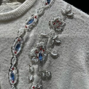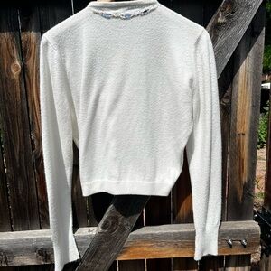 Adorable 50s vintage orlon sweater with a few jewels missing and some pulling. Still cute! Still perfect for that sock hop, Halloween costume or just throwing on over a sundress for that Olivia Newton John look. Measures 19" pit to pit, 19 in long.