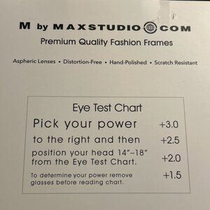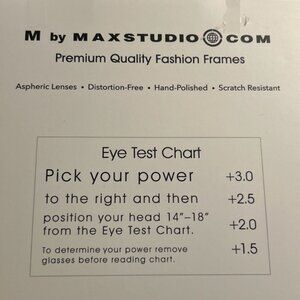 Enhance your reading experience with the M by Max Studio Reading Glasses. This box set includes three stylish pairs of readers, each with a magnification of +3.00. Designed for both comfort and durability, these glasses are constructed with high-quality materials and feature a scratch-resistant coating, ensuring longevity and clear vision. The frames are sleek and modern, crafted in a classic black color that complements any outfit. Perfect for use at home, in the office, or on the go, these reading glasses are the ideal accessory for anyone needing a little visual assistance. New in box (NIB), they make a great gift or personal purchase for enhanced convenience and style in reading.