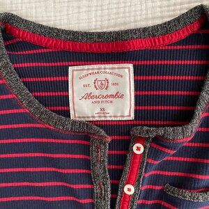Abercrombie & Fitch super comfy one piece pajamas. Dark gray elbow patches, trim and cuffs create fun details. Gently worn, excellent condition.