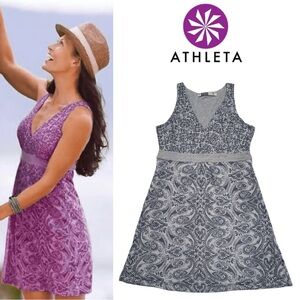 Athleta dress with a paisley pattern. Lined, sleeveless design with a flattering fit. Materials: 53% Polester, 47% cotton.