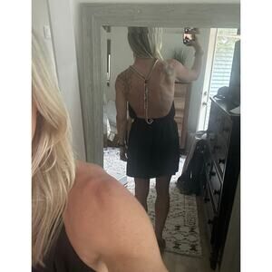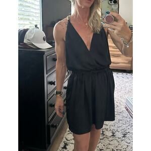 Sleeveless satin charmeuse minidress with a woven silvertone and goldtone curb chain halterneck and back strap.