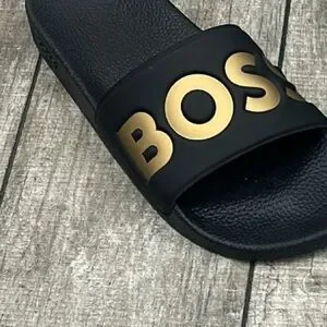 Elegant Boss slides featuring a bold gold logo. Comfortable and stylish for everyday wear.