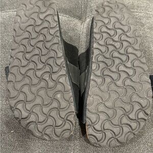 These are Birkenstock Kyoto in black suede with a black leather strap. They are in good used condition. They have minimal wear on the sole. There is minor staining on the inner tan suede.