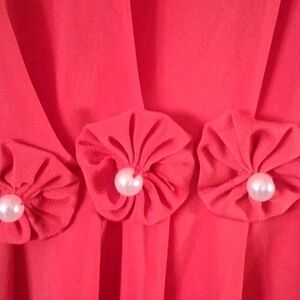 This blouse has short fluttering sleeves and is a pullover. It features a round neckline and is made of polyester. The color is orange and has pearl-like accents.