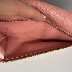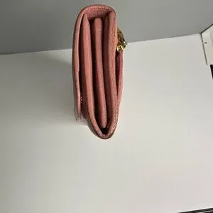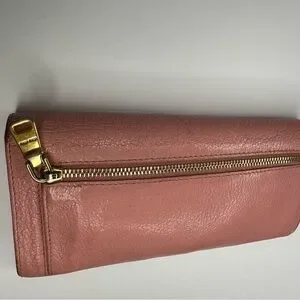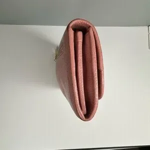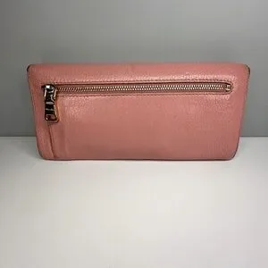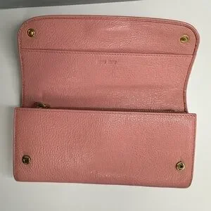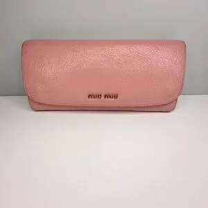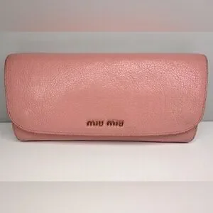 Elegant pink leather wallet. Features Miu Miu logo. Sleek and stylish design.