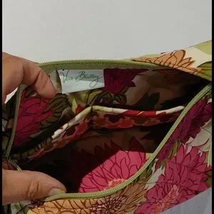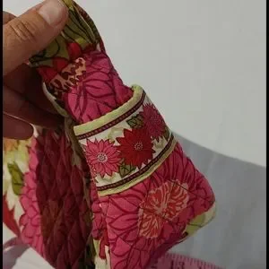 Good used condition. Zip closure. Two small outside pockets. Two inside pockets. Colors: pink, green, white.