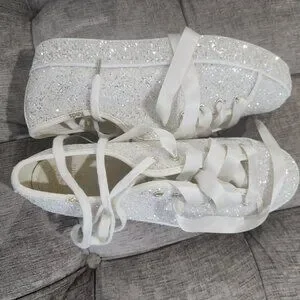 Elevate your outfit with these platform all around glitter women's sneakers by collaboration Keds and Kate Spade. Ivory/cream color with ribbon and regular laces. Getting married and do not want to spend the day in heels, have these on hand as platform enough for your dress and comfortable. These are definitely bling and dressy but can just also wear to perk up your denim outfit or shorts. Don't miss these actually all-over glitter sneakers, even on the rubber platform and sold out. Hard to find.