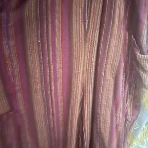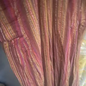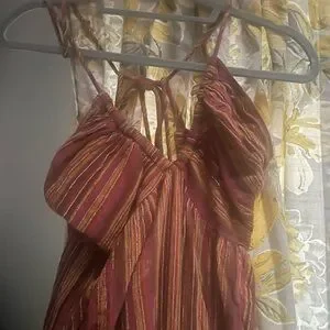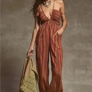 Elevate your style with this chic striped jumpsuit. Featuring a blend of red and brown hues, it's perfect for any occasion. Enjoy comfort and elegance in one stunning piece. Only worn once