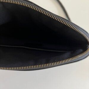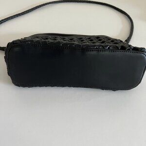 elegant woven leather bag in black. has a unique half-moon or arch silhouette. comes with Bembien's Woven Crossbody Strap. Bembien sells interchangeable straps.