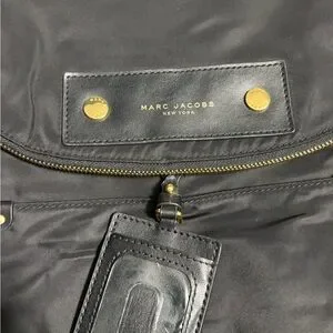 Elegant black nylon bag by Marc Jacobs. Features gold accents and sleek design.