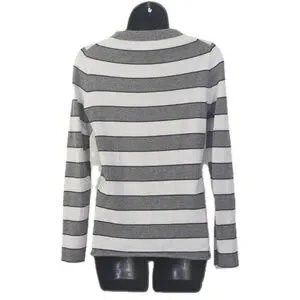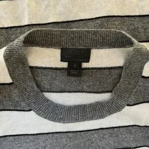 As seen on the TV show Modern Family! A classic J. Crew cashmere style with contrasting grey stripes for a fresh restart for fall. The material is so soft and the crew neck and rolled details at the hem and on the sleeves are so unique at fun. Please note that the tag on the inside of the shirt near the bottom edge has been removed without damage to the sweater