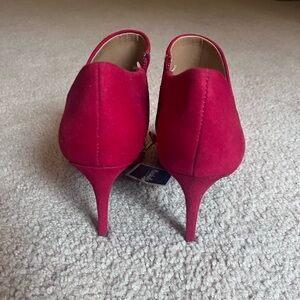 Chic red suede boots with a sleek design. Perfect for elevating any outfit.