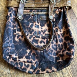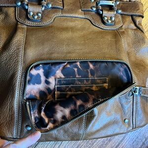 Brown leather satchel bag from B. Makowsky. Textured leather with silver metal accents. Two shoulder handles & full top zip closure. Embellished with moto style straps, studs & signed silver bars. Front has zip pocket with card holders & back has a small slide pocket. Inside has animal print fabric lining, zip compartment, 2 slide pockets & signed leather brand label. Light brown or dark tan color. Gorgeous retro vibe designer bag!